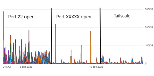 I initially left the standard “port 22 open to the world” for 4-5 days, I then moved sshd to a different port (still open to the whole world), and finally I closed everything and turned on tailscale. You find a visualization of the resulting egress traffic in the image. Different colors are different areas of the world. Ignore the orange spikes which were my own ssh connections to set up stuff.